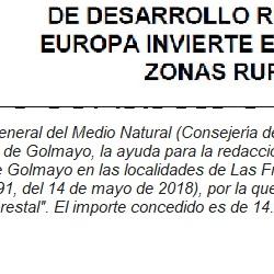 "con fecha 18 de diciembre de 2020, la Dirección General del Medio Natural ( Consejería de Fomento y Medio Ambiente de la Junta de Castilla y León) resolvió conceder al Ayuntamiento de Golmayo, la ayuda para la redacción del Proyecto de Ordenación del Monte de Libre Disposición perteneciente al Ayuntamiento de Golmayo en las localidades de Las Fraguas y La Mallona, al amparo de la Orden de 3 de mayo de 2018 ( publicada en el BOCYL nº 91, del 14 de mayo de 2018), por la que se convocan ayudas cofinanciadas por el FEADER para la redacción de planes de gestión forestal". El importe concedido es de14.350,52 Euros.